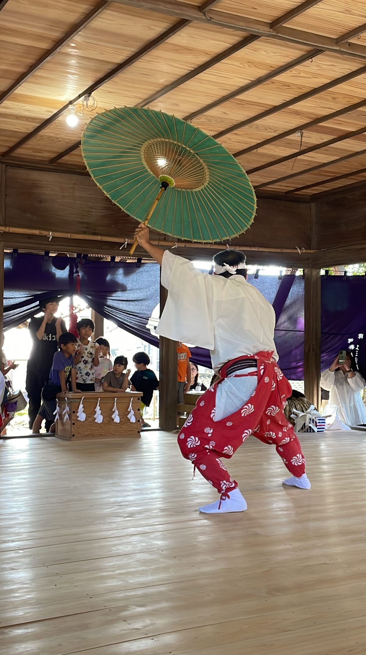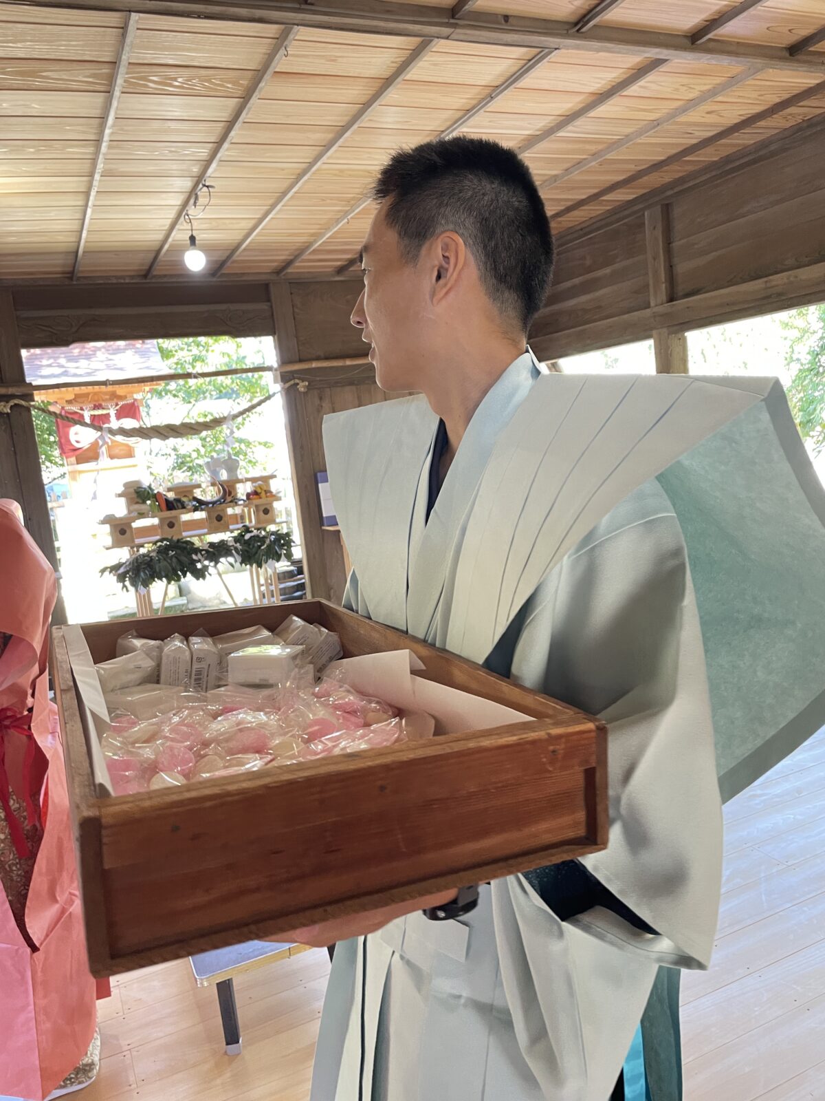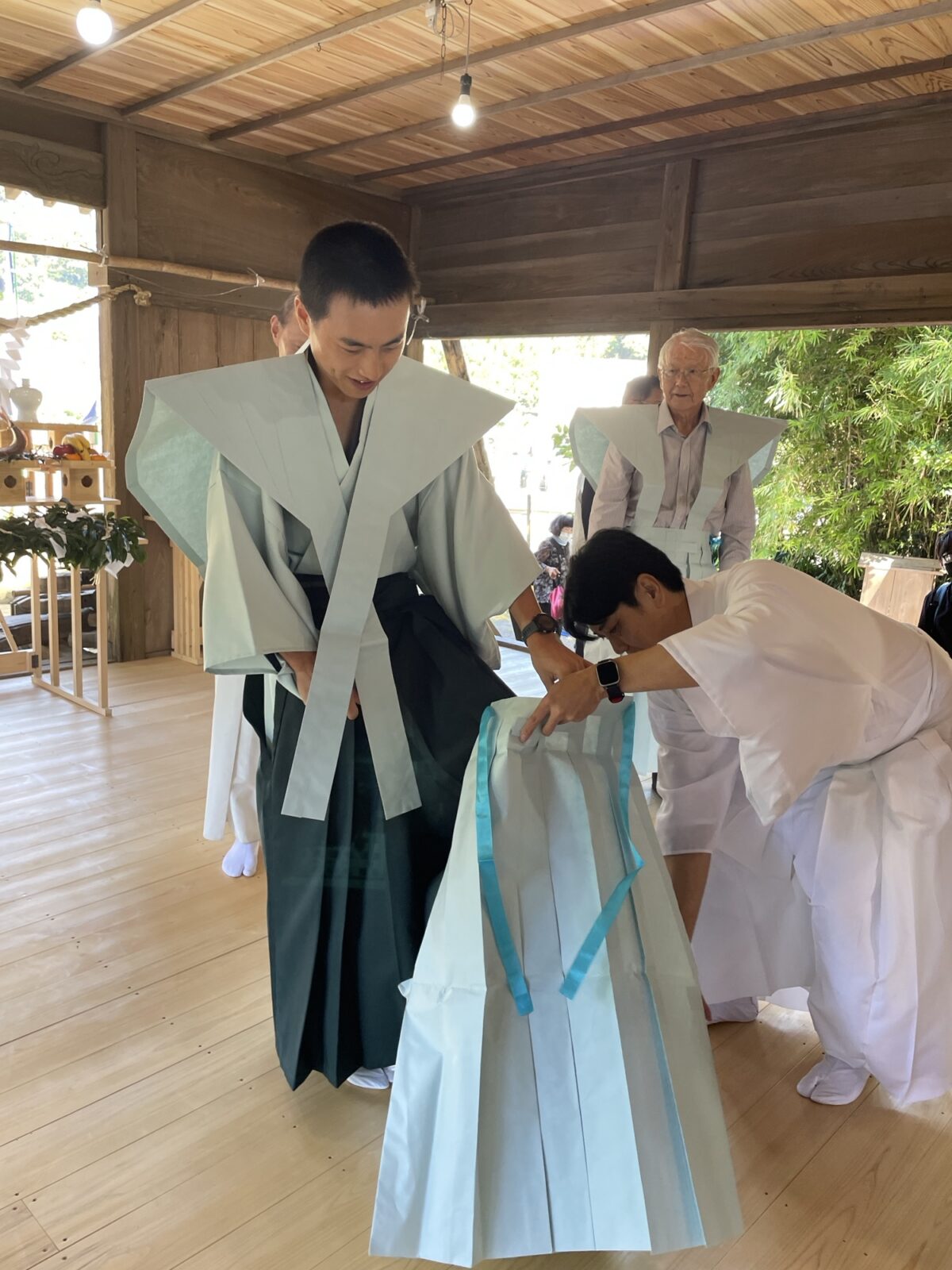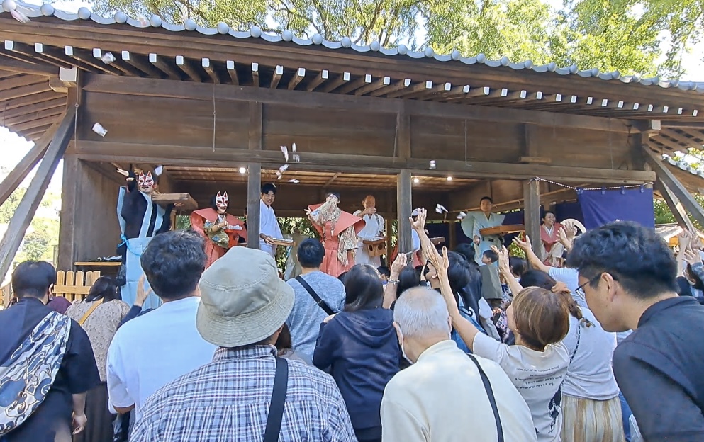 和紙の裃(かみしも)が用意されていて大輝と麻由子も餅まきに参加。
