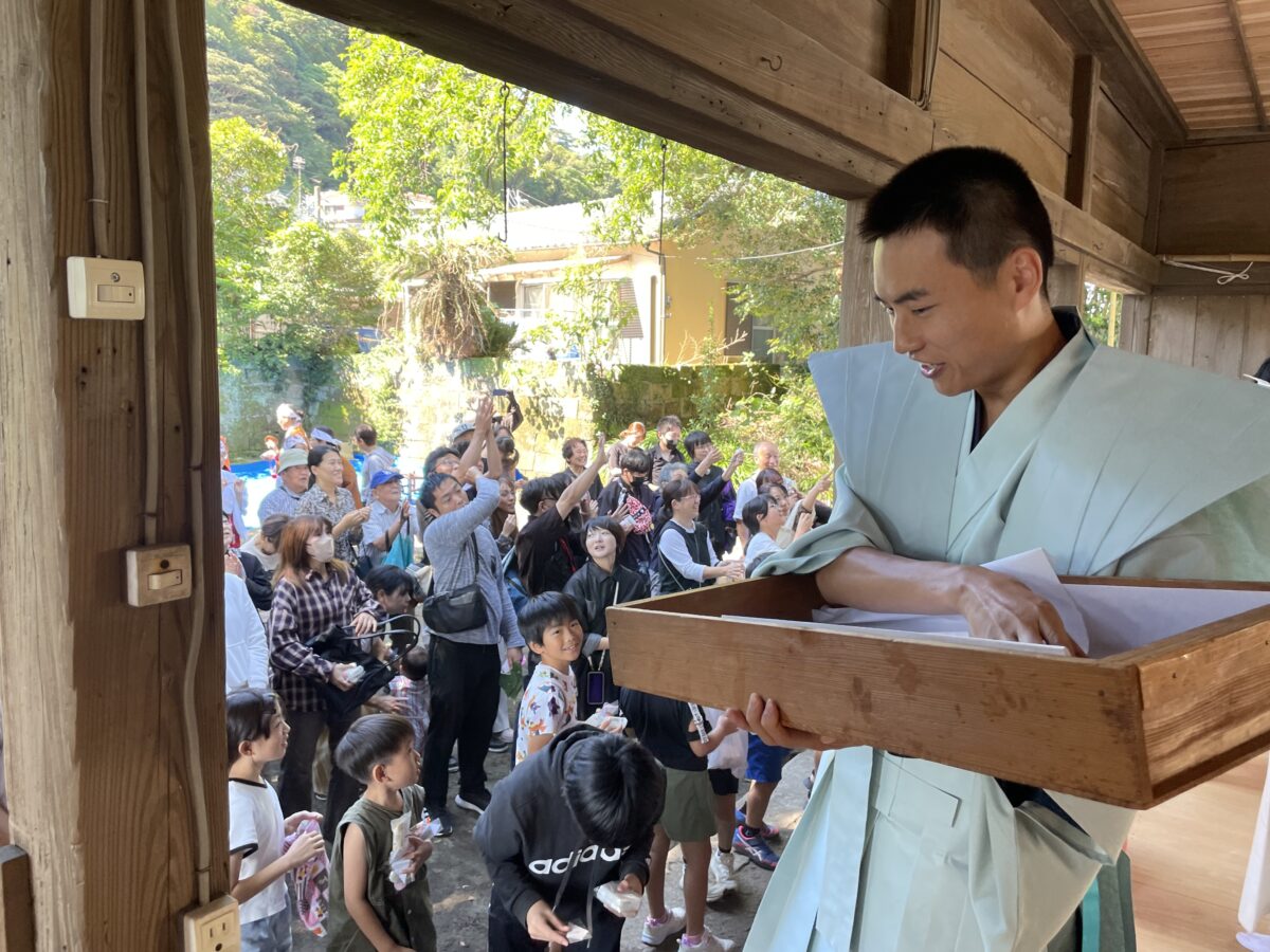 奉納後には、奉祝行事として紅白祝餅、軽羹、祝銭撒きを行い町内の皆さんと共に交流しました。