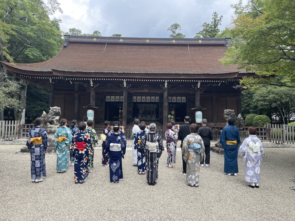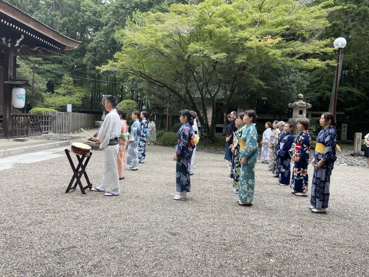 お浚い会前にご祈祷を受け、多田の市で賑わう中拝殿前にて奉納演奏を行い、皆の成功を祈願しました。